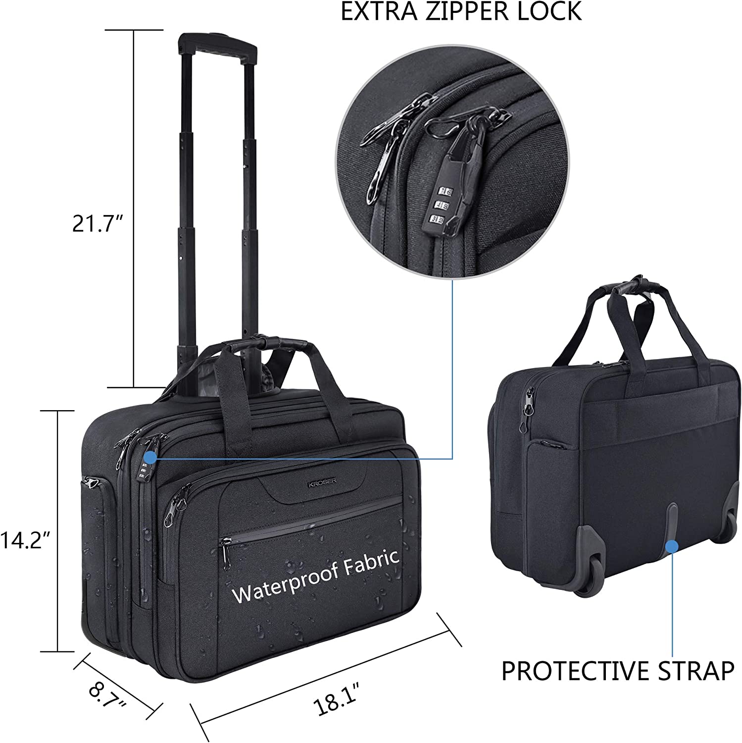 KROSER กระเป๋าแล็ปท็อปแบบม้วน กระเป๋าเอกสารล้อพรีเมียมเหมาะสำหรับแล็ปท็อปกันน้ำได้ถึง 17.3 นิ้ว กระเป๋าคอมพิวเตอร์พร้อมกระเป๋าคอมพิวเตอร์พร้อมกระเป๋า RFID สำหรับการเดินทาง/ธุรกิจ/โรงเรียน/ผู้ชาย/ผู้หญิง-สีดำา